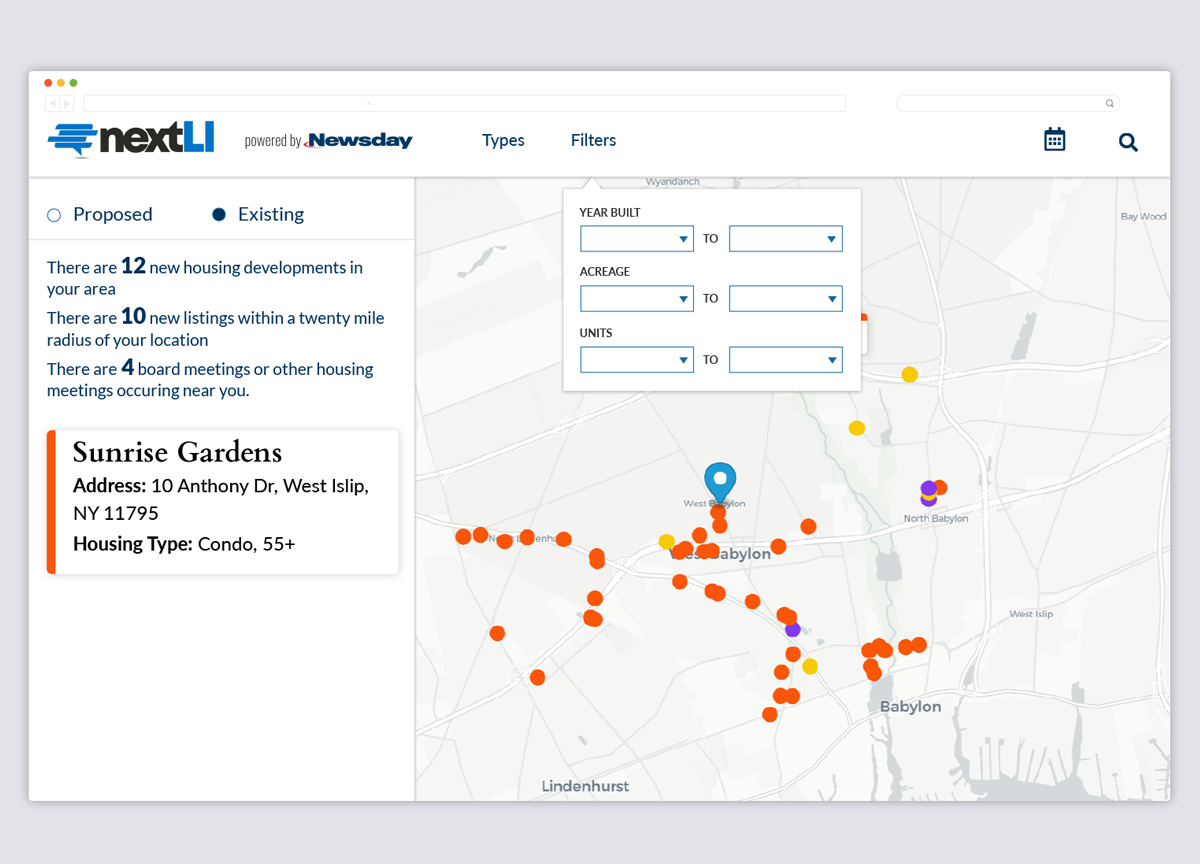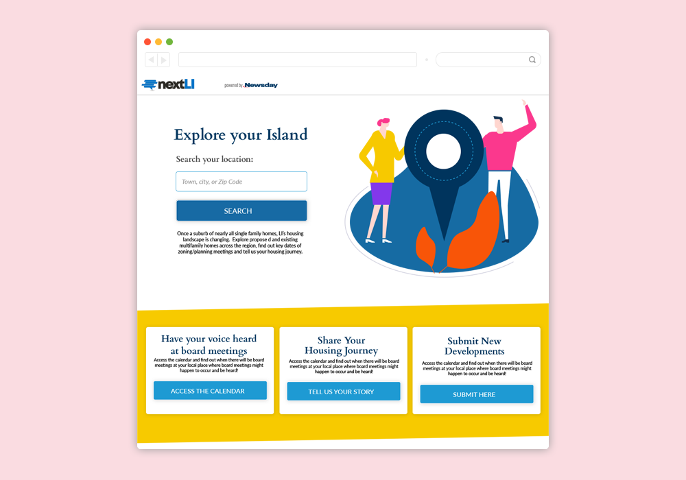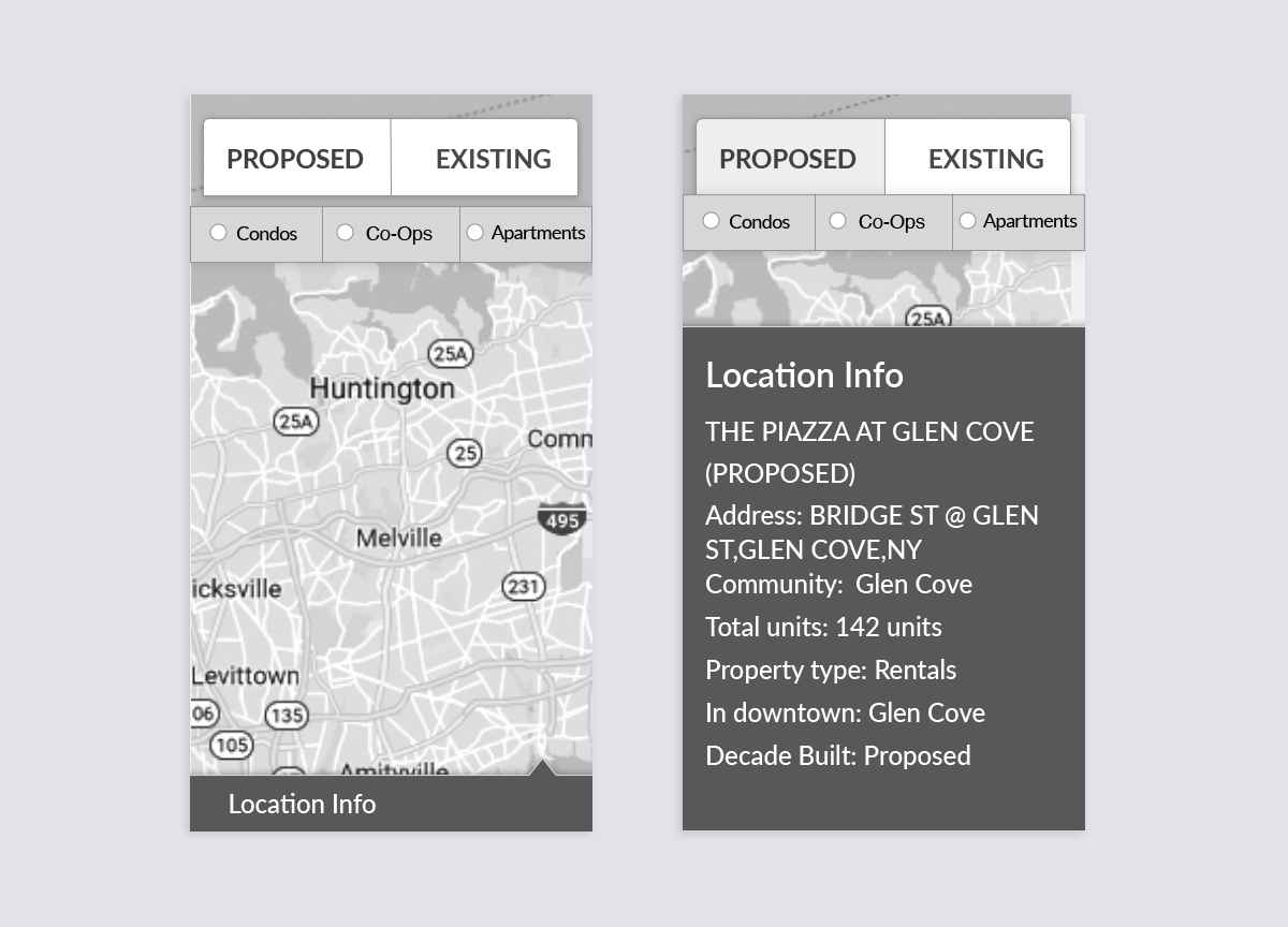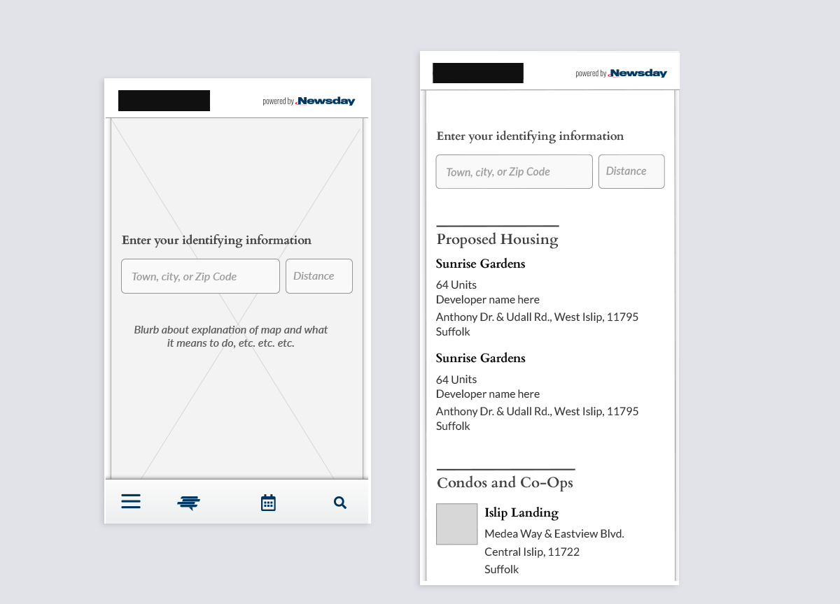 My second project at Newsday Media Group was to redesign a series of interactive maps. Originally one map containing a dozen different layers, we broke the maps out and worked on the housing information data first. Instead of a map with information, I designed a landing page, to better communicate information to our users, on where to find zoning meetings and submit housing information, before taking them to the map with real estate information. This solution better told the story of our maps, and enables our users to find the information they need.