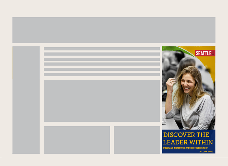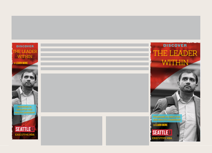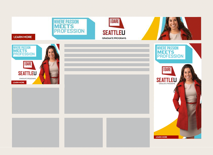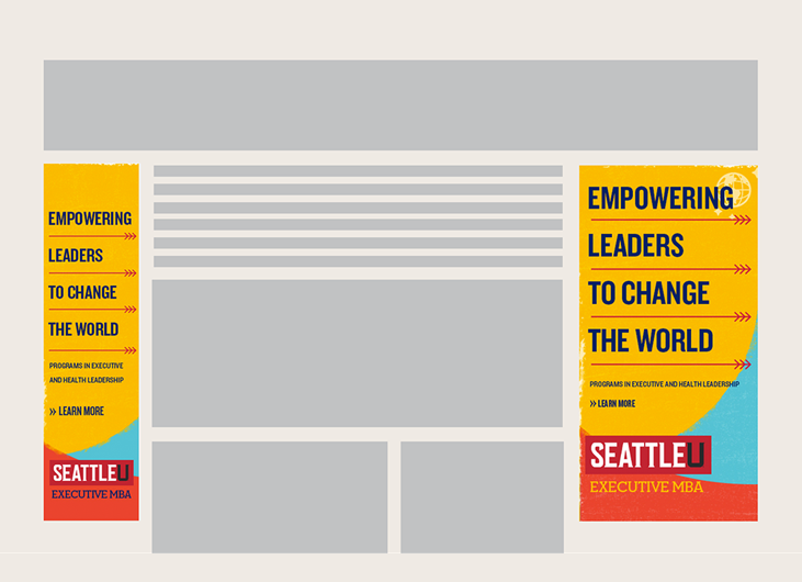 One of my roles at Seattle University was to design their digital advertising. These ads were done for our MBA and Executive MBA programs throughout the course of my time there. These helped to drive interest in the colleges and the degree programs they offered, working toward our marketing team goal of driving enrollment.