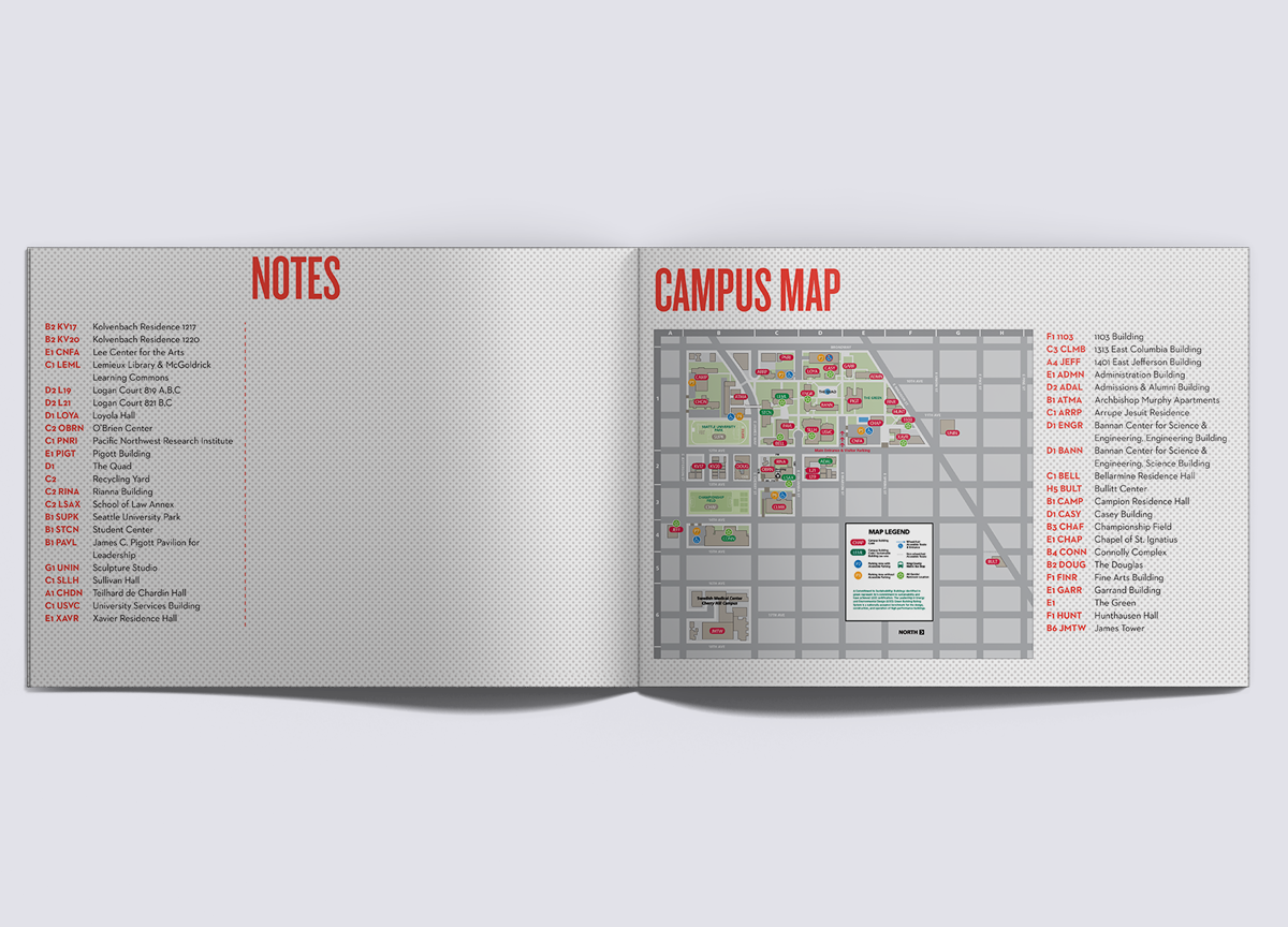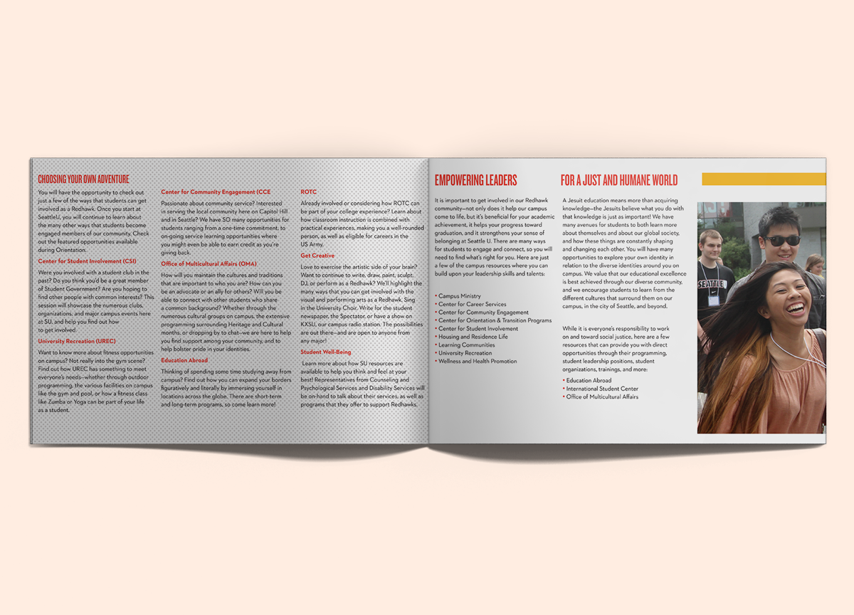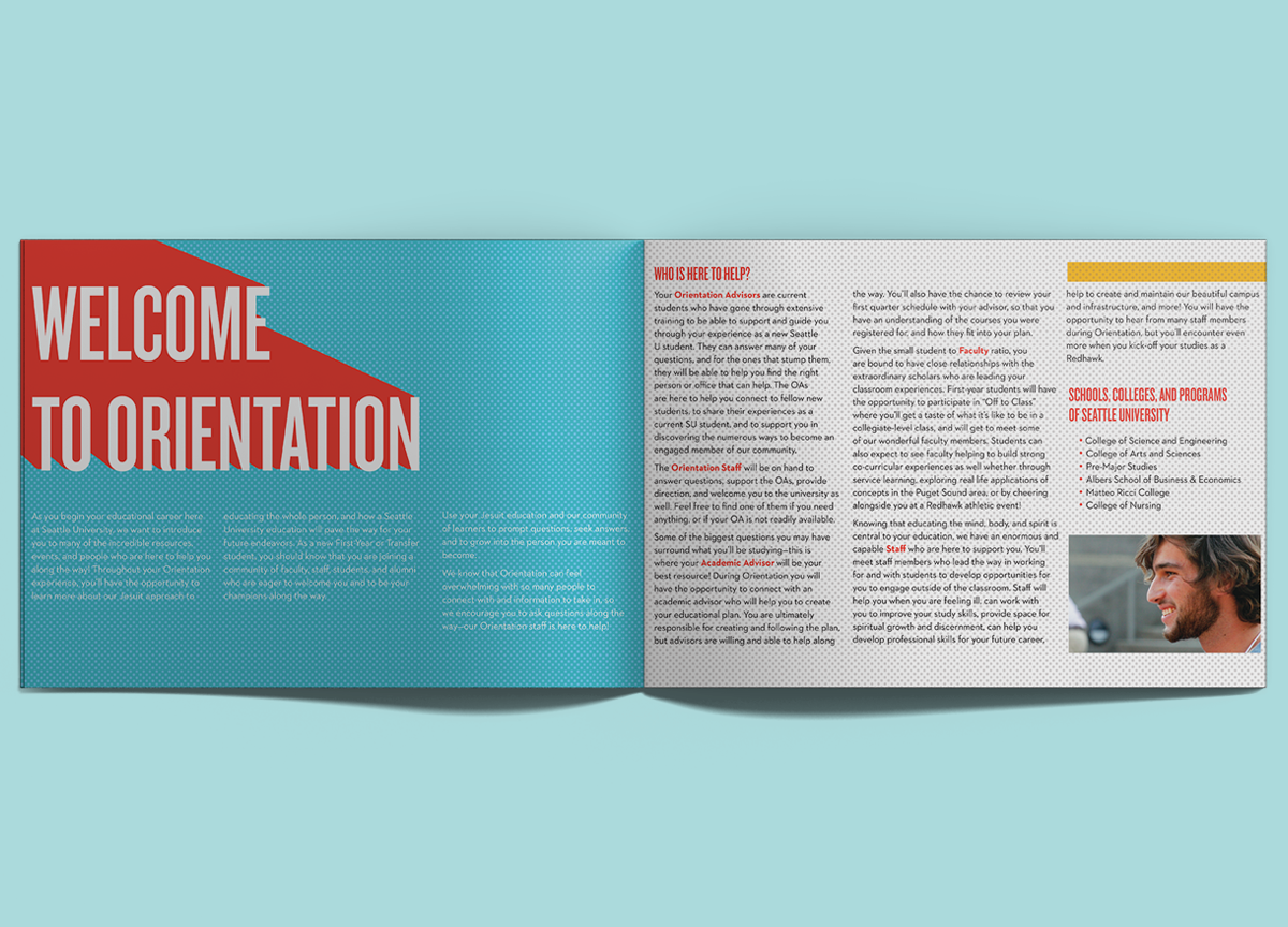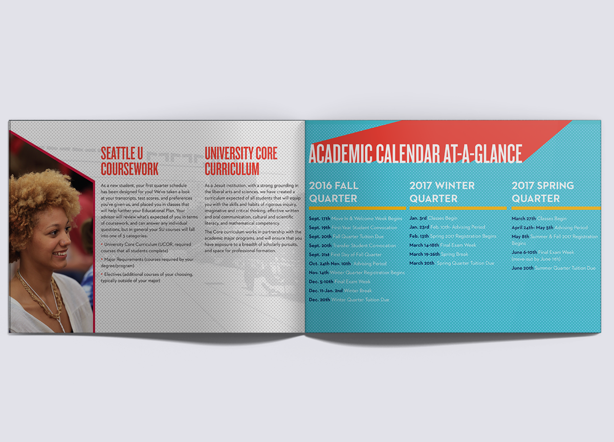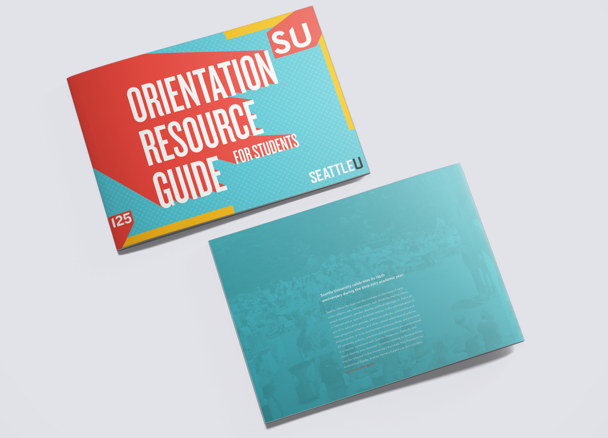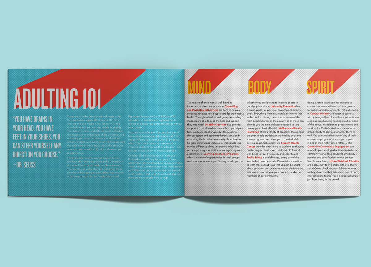 This is a guide that was designed for Seattle University's New Student Orientation. This guide was designed for students, with a companion guide for parents. I chose bright colors and dynamic tyopgrahpy to convey the youthful atmosphere of a new student program, drawing in the students with dynamic design, while preparing them for the college experience to they were about to experience.