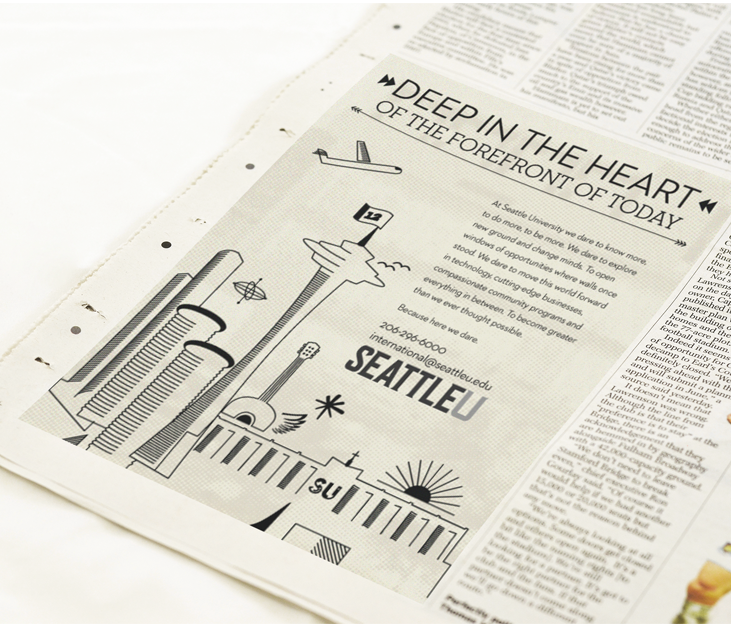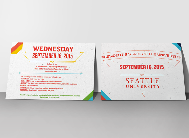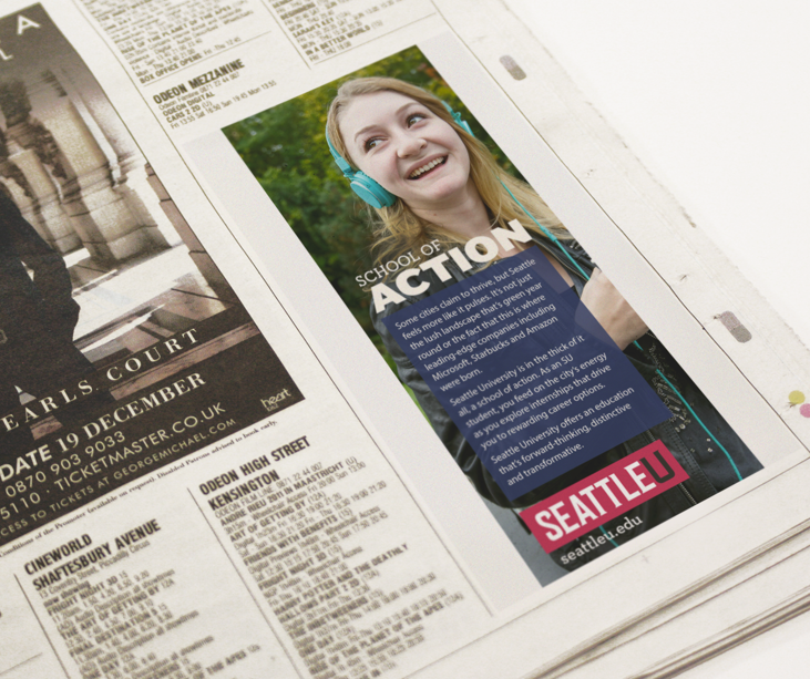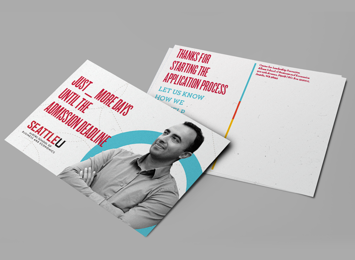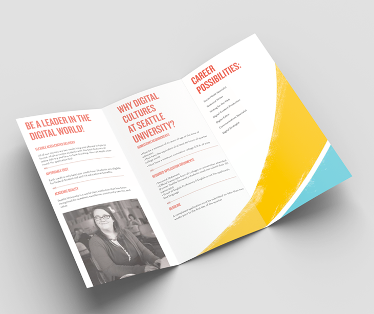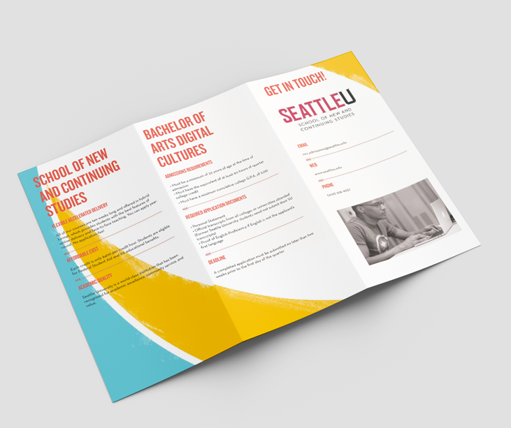 While I was working there, Seattle University underwent a major rebranding effort. It took over a year to fully roll out the new brand. One of the major parts of this roll out was to completely redo all of our print materials, for the main Seattle University umbrella as well as the individual colleges and degree programs. As a part of the main marketing department, I created several different kinds of print pieces for this roll out.