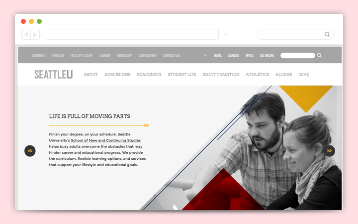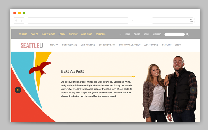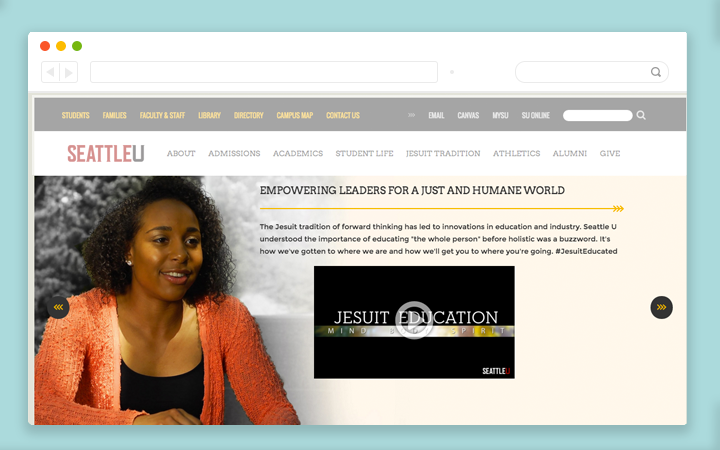 When Seattle University rebranded, we needed new assets for our website. These were fun to create, and helped teach us about how to implement our new brand. They were high visiblity pieces, that were displayed on the front page of our website, as part of the carousel slider.